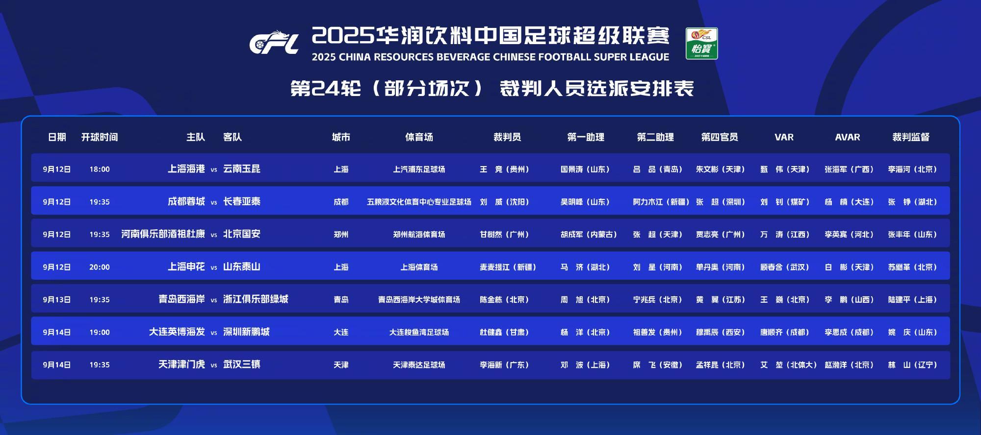 其他场次比赛裁判选派为:上海海港主场与云南玉昆的比赛由王竞执哨,成都蓉城与长春亚泰的比赛由刘威执哨,河南队与北京国安的比赛由甘树然执哨,青岛西海岸与浙江队的比赛由陈金栋执哨,大连英博与深圳新鹏城的比赛由杜健鑫执哨,天津津门虎与武汉三镇的比赛由李海新执哨。