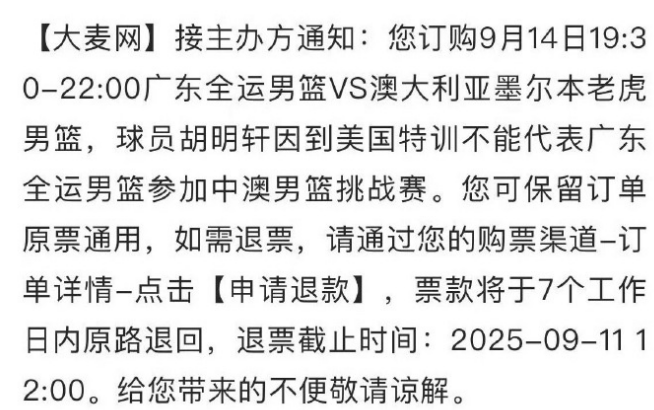 胡明轩证明了自己的实力,但他也存在发挥不稳定的问题。如今根据售票网站的公告显示,胡明轩将缺席9月14日的广东全运男篮的热身赛,无缘对阵澳大利亚墨尔本老虎的比赛,他将赴美特训。