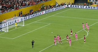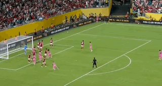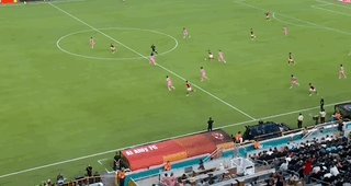 第90+6分钟,迈阿密右侧战术角球,梅西直接吊门打后角,门将希纳维伸手一托,皮球砸中横梁弹出。